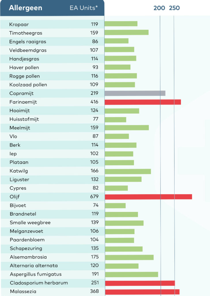 Bij Bowie hebben we een bloedonderzoek laten doen. Bij een bloedonderzoek wordt er door de dierenarts bloed afgenomen bij de hond, wat vervolgens in het laboratorium wordt getest. Eerst wordt er gekeken of er sprake is van een omgevingsallergie. Wanneer er wordt vastgesteld dat er inderdaad sprake is van een omgevingsallergie, kan je verder onderzoek doen om te achterhalen op welke allergenen je hond reageert. Dit hebben we ook voor Bowie gedaan. Onze dierenarts werkte hiervoor met Nextmune. Nadat alle testresultaten binnen waren, kregen we een brochure met daarin de verschillende scores op de allergenentest en verdere informatie over immunotherapie.